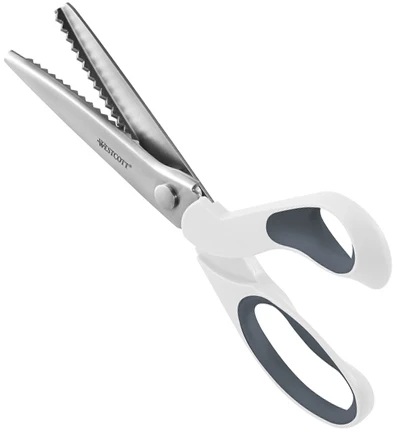Clauss Zackenschere zum präzisen Schneiden von Stoffen und anderen Materialien. Durch das Schneiden der Stoffkanten mit dieser Schere franst das Material nicht aus. Edelstahlklingen mit ergonomisch geformten Softgrip-Griffen für mehr Komfort beim Schneiden. Scherengröße: 24cm / 9,5″. Farbe: Weiß/Grau